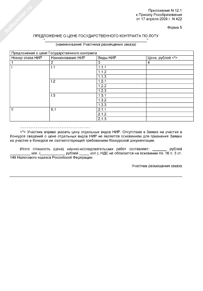 Конкурсная документация открытого конкурса (многолотовая) на выполнение научно-исследовательских работ по проекту, проводимому в рамках реализации федеральных целевых, государственных и иных программ в сфере образования, воспитания и развития общедоступных образовательных ресурсов. Формы документов, представляемых участником размещения заказа в составе заявки на участие в конкурсе по лоту. Предложение о цене государственного контракта (форма № 5)