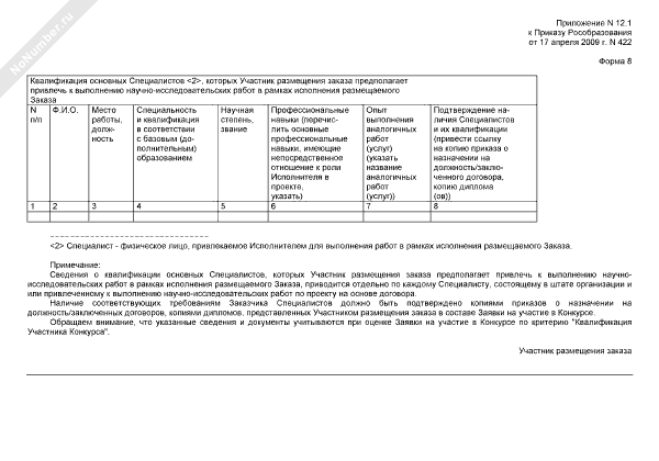 Конкурсная документация открытого конкурса (многолотовая) на выполнение научно-исследовательских работ по проекту, проводимому в рамках реализации федеральных целевых, государственных и иных программ в сфере образования, воспитания и развития общедоступных образовательных ресурсов. Формы документов, представляемых участником размещения заказа в составе заявки на участие в конкурсе по лоту. Квалификация основных специалистов, которых участник размещения заказа предполагает привлечь к выполнению научно-исследовательских работ в рамках исполнения размещаемого заказа (форма № 8)
