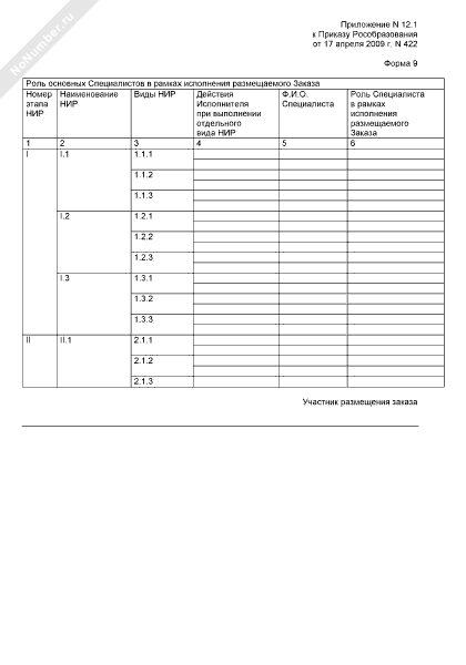 Конкурсная документация открытого конкурса (многолотовая) на выполнение научно-исследовательских работ по проекту, проводимому в рамках реализации федеральных целевых, государственных и иных программ в сфере образования, воспитания и развития общедоступных образовательных ресурсов. Формы документов, представляемых участником размещения заказа в составе заявки на участие в конкурсе по лоту. Роль основных специалистов в рамках исполнения размещаемого заказа (форма № 9)