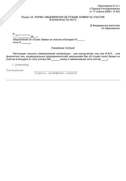 Конкурсная документация открытого конкурса (многолотовая) на выполнение научно-исследовательских работ по проекту, проводимому в рамках реализации федеральных целевых, государственных и иных программ в сфере образования, воспитания и развития общедоступных образовательных ресурсов. Форма уведомления об отзыве заявки на участие в конкурсе по лоту