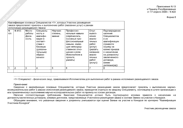 Конкурсная документация открытого конкурса (для размещения заказа по многолетним проектам) на выполнение научно-исследовательских работ по проекту, проводимому в рамках реализации федеральных целевых, государственных и иных программ в сфере образования, воспитания и развития общедоступных образовательных ресурсов. Формы документов, представляемых участником размещения заказа в составе заявки на участие в конкурсе. Квалификация основных специалистов, которых участник размещения заказа предполагает привлечь к выполнению работ (оказанию услуг) в рамках исполнения размещаемого заказа (форма № 8)
