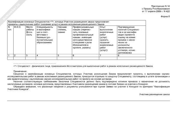 Конкурсная документация открытого конкурса (для размещения заказа у субъектов малого предпринимательства) на выполнение научно-исследовательских работ по проекту, проводимому в рамках реализации федеральных целевых, государственных и иных программ в сфере образования, воспитания и развития общедоступных образовательных ресурсов. Формы документов, представляемых участником размещения заказа в составе заявки на участие в конкурсе. Квалификация основных специалистов, которых участник размещения заказа предполагает привлечь к выполнению работ (оказанию услуг) в рамках исполнения размещаемого заказа (форма № 8)