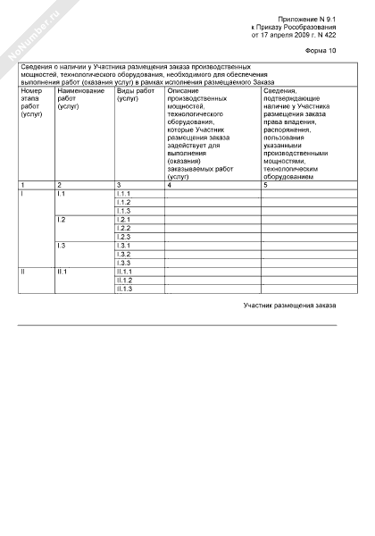 Конкурсная документация открытого конкурса для размещения заказа у субъектов малого предпринимательства (многолотовая) на выполнение работ (оказание услуг) по проекту, проводимому в рамках реализации федеральных целевых, государственных и иных программ в сфере образования, воспитания и развития общедоступных образовательных ресурсов. Формы документов, представляемых участником размещения заказа в составе заявки на участие в конкурсе по лоту. Сведения о наличии у участника размещения заказа производственных мощностей, технологического оборудования, необходимого для обеспечения выполнения работ (оказания услуг) в рамках исполнения размещаемого заказа (форма № 10)