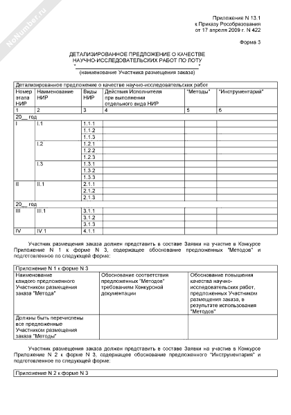 Конкурсная документация открытого конкурса для размещения заказа по многолетним проектам (многолотовая) на выполнение научно-исследовательских работ по проекту, проводимому в рамках реализации федеральных целевых, государственных и иных программ в сфере образования, воспитания и развития общедоступных образовательных ресурсов. Формы документов, представляемых участником размещения заказа в составе заявки на участие в конкурсе по лоту. Детализированное предложение о качестве научно-исследовательских работ по лоту (форма № 3)