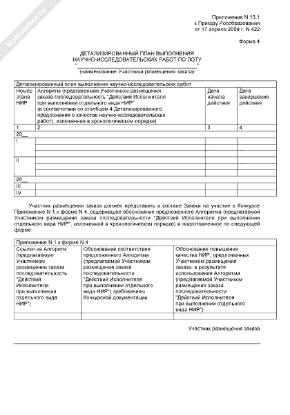 Конкурсная документация открытого конкурса для размещения заказа по многолетним проектам (многолотовая) на выполнение научно-исследовательских работ по проекту, проводимому в рамках реализации федеральных целевых, государственных и иных программ в сфере образования, воспитания и развития общедоступных образовательных ресурсов. Формы документов, представляемых участником размещения заказа в составе заявки на участие в конкурсе по лоту. Детализированный план выполнения научно-исследовательских работ по лоту (форма № 4)