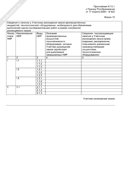 Конкурсная документация открытого конкурса для размещения заказа по многолетним проектам (многолотовая) на выполнение научно-исследовательских работ по проекту, проводимому в рамках реализации федеральных целевых, государственных и иных программ в сфере образования, воспитания и развития общедоступных образовательных ресурсов. Формы документов, представляемых участником размещения заказа в составе заявки на участие в конкурсе по лоту. Сведения о наличии у участника размещения заказа производственных мощностей, технологического оборудования, необходимого для обеспечения выполнения научно-исследовательских работ в рамках исполнения размещаемого заказа (форма № 10)