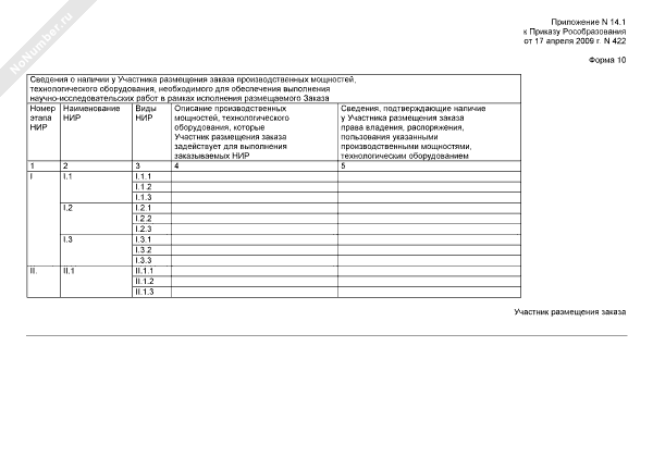 Конкурсная документация открытого конкурса для размещения заказа у субъектов малого предпринимательства (многолотовая) на выполнение научно-исследовательских работ по проекту, проводимому в рамках реализации федеральных целевых, государственных и иных программ в сфере образования, воспитания и развития общедоступных образовательных ресурсов. Формы документов, представляемых участником размещения заказа в составе заявки на участие в конкурсе по лоту. Сведения о наличии у участника размещения заказа производственных мощностей, технологического оборудования, необходимого для обеспечения выполнения научно-исследовательских работ в рамках исполнения размещаемого заказа (форма № 10)