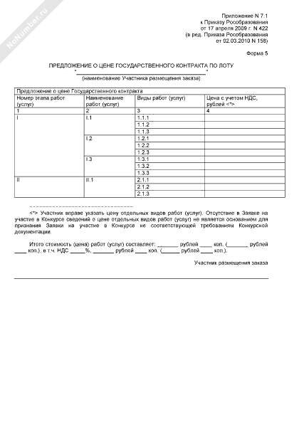 Конкурсная документация открытого конкурса (многолотовая, для размещения по многолетним проектам) на выполнение работ (оказание услуг) по проекту, проводимому в рамках реализации федеральных целевых, государственных и иных программ в сфере образования, воспитания и развития общедоступных образовательных ресурсов. Формы документов, представляемых участником размещения заказа в составе заявки на участие в конкурсе Рособразования по лоту. Предложение о цене государственного контракта по лоту (форма № 5)
