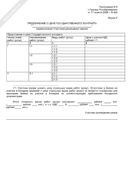 Конкурсная документация открытого конкурса (для размещения заказа у субъектов малого предпринимательства) на выполнение работ (оказание услуг) по проекту, проводимому в рамках реализации федеральных целевых, государственных и иных программ в сфере образования, воспитания и развития общедоступных образовательных ресурсов. Формы документов, представляемых участником размещения заказа в составе заявки на участие в конкурсе. Предложение о цене государственного контракта (форма № 5)