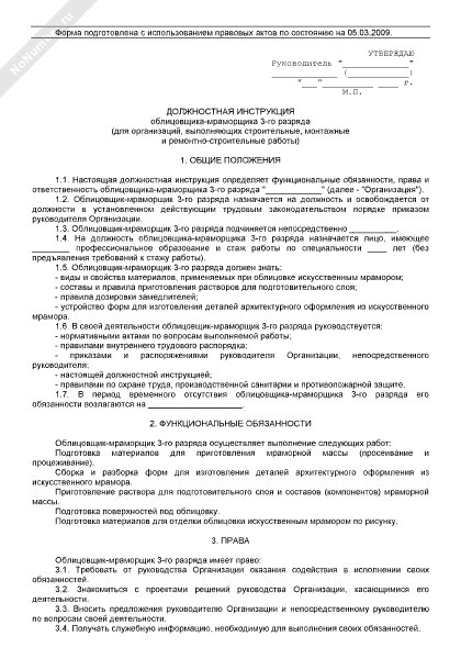 - 262Должностная инструкция облицовщика-мраморщика 3-го разряда (для организаций, выполняющих строительные, монтажные и ремонтно-строительные работы)
