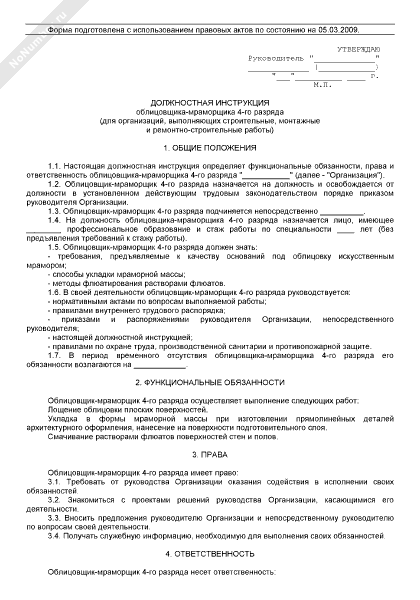 - 264Должностная инструкция облицовщика-мраморщика 4-го разряда (для организаций, выполняющих строительные, монтажные и ремонтно-строительные работы)