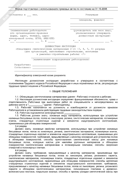 - 277Должностная инструкция облицовщика синтетическими материалами 2-го (3, 4, 5, 6) разряда (для организаций, выполняющих строительные, монтажные и ремонтно-строительные работы)