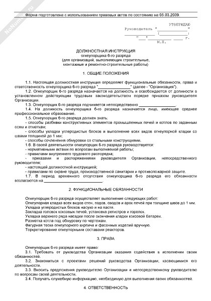 - 265Должностная инструкция огнеупорщика 6-го разряда (для организаций, выполняющих строительные, монтажные и ремонтно-строительные работы)