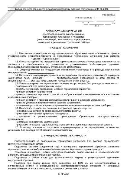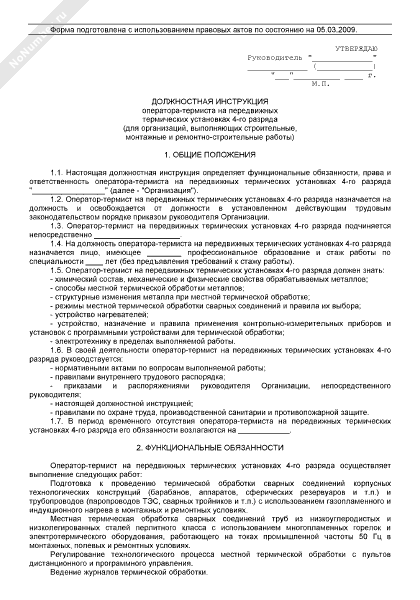 - 267Должностная инструкция оператора-термиста на передвижных термических установках 3-го разряда (для организаций, выполняющих строительные, монтажные и ремонтно-строительные работы)