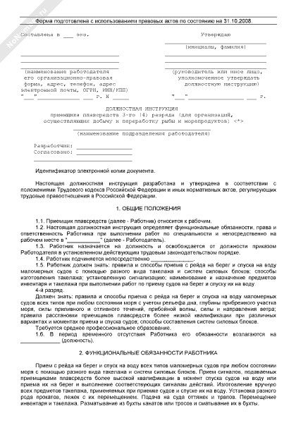 - 274Должностная инструкция приемщика плавсредств 3-го (4) разряда (для организаций, осуществляющих добычу и переработку рыбы и морепродуктов)