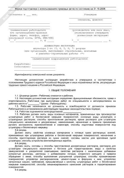 - 275Должностная инструкция штукатура 2-го (3, 4, 5, 6, 7) разряда (для организаций, выполняющих строительные, монтажные и ремонтно-строительные работы)