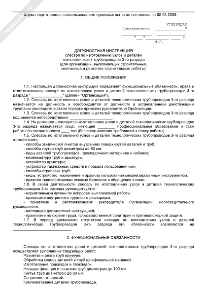 - 269Должностная инструкция слесаря по изготовлению узлов и деталей технологических трубопроводов 3-го разряда (для организаций, выполняющих строительные, монтажные и ремонтно-строительные работы)