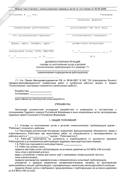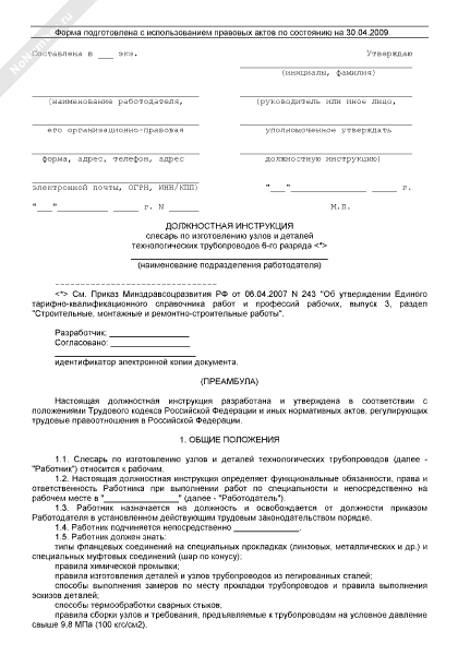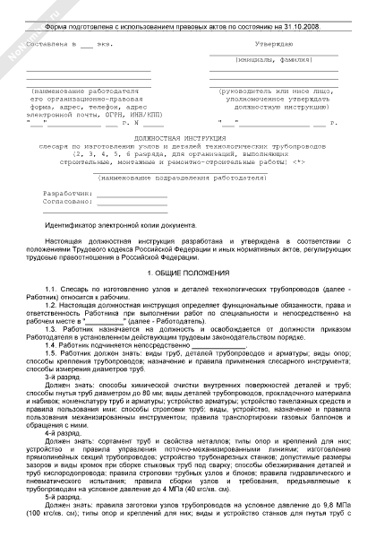 - 270Должностная инструкция слесаря по изготовлению узлов и деталей технологических трубопроводов (2, 3, 4, 5, 6 разряда, для организаций, выполняющих строительные, монтажные и ремонтно-строительные работы)