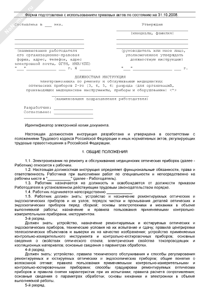 - 332Должностная инструкция электромеханика по ремонту и обслуживанию медицинских оптических приборов 2-го (3, 4, 5, 6) разряда (для организаций, производящих медицинские инструменты, приборы и оборудование)