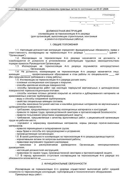 - 337Должностная инструкция изолировщика по термоизоляции 4-го разряда (для организаций, выполняющих строительные, монтажные и ремонтно-строительные работы)
