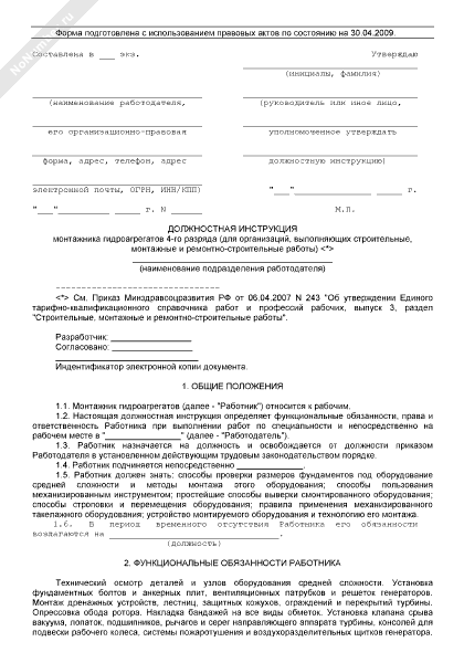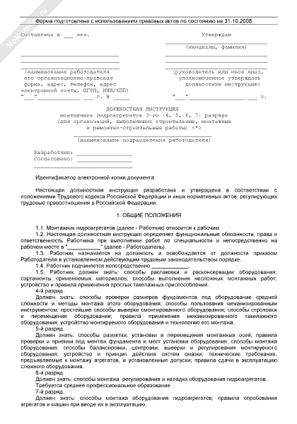 - 324Должностная инструкция монтажника гидроагрегатов 3-го (4, 5, 6, 7) разряда (для организаций, выполняющих строительные, монтажные и ремонтно-строительные работы)