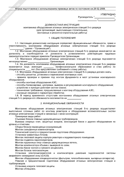 - 338Должностная инструкция монтажника оборудования атомных электрических станций 5-го разряда (для организаций, выполняющих строительные, монтажные и ремонтно-строительные работы)