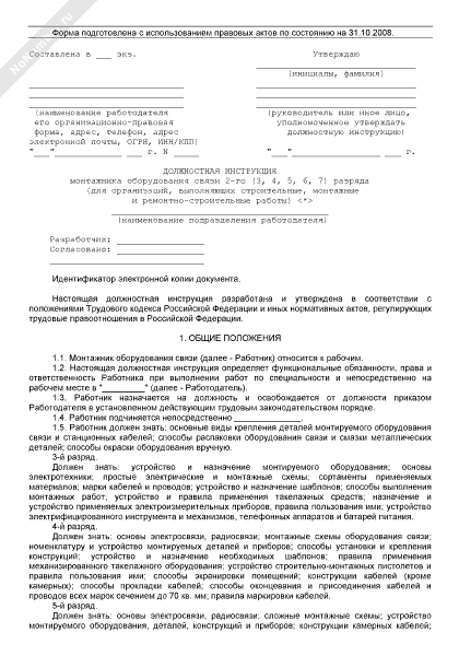 - 334Должностная инструкция монтажника оборудования связи 2-го (3, 4, 5, 6, 7) разряда (для организаций, выполняющих строительные, монтажные и ремонтно-строительные работы)