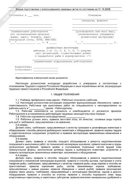 - 322Должностная инструкция рыбовода 1-го (2, 3, 4, 5, 6, 7) разряда (для организаций, осуществляющих добычу и переработку рыбы и морепродуктов)