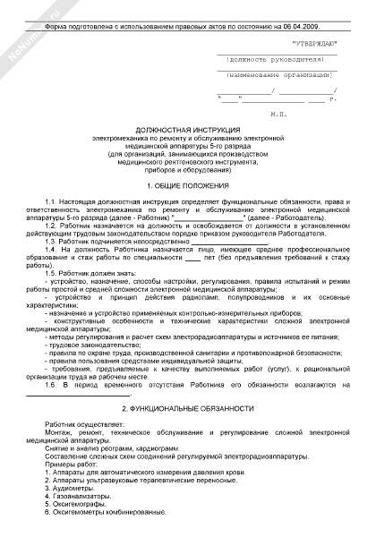- 478Должностная инструкция электромеханика по ремонту и обслуживанию электронной медицинской аппаратуры 5-го разряда (для организаций, занимающихся производством медицинского рентгеновского инструмента, приборов и оборудования)