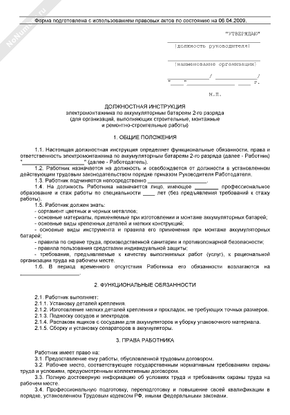 - 470Должностная инструкция электромонтажника по аккумуляторным батареям 2-го разряда (для организаций, выполняющих строительные, монтажные и ремонтно-строительные работы)