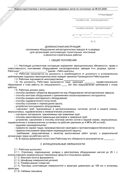- 465Должностная инструкция монтажника оборудования металлургических заводов 4-го разряда (для организаций, выполняющих строительные, монтажные и ремонтно-строительные работы)