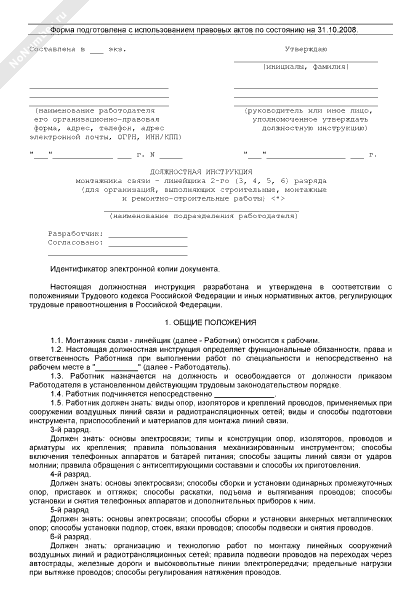 - 475Должностная инструкция монтажника связи — линейщика 2-го (3, 4, 5, 6) разряда (для организаций, выполняющих строительные, монтажные и ремонтно-строительные работы)