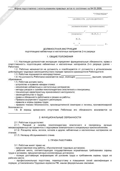 - 462Должностная инструкция подготовщика набивочных и настилочных материалов 1-го разряда