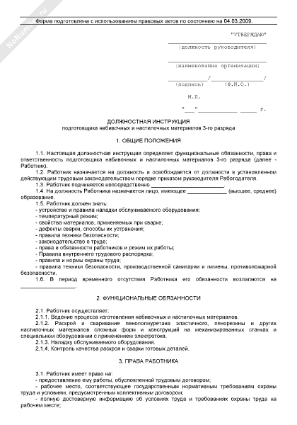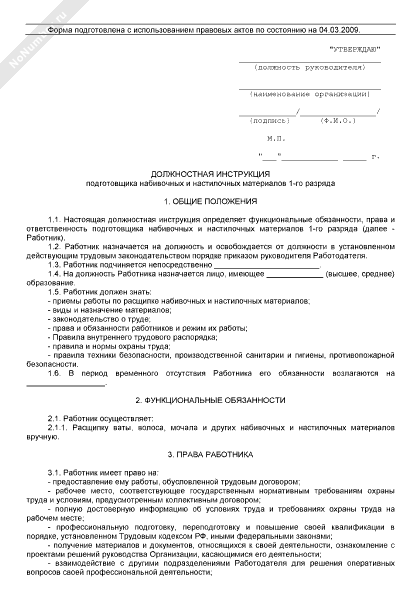 - 464Должностная инструкция подготовщика набивочных и настилочных материалов 3-го разряда