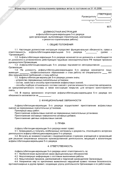 - 612Должностная инструкция асфальтобетонщика-варильщика 5-го разряда (для организаций, выполняющих строительные, монтажные и ремонтно-строительные работы)