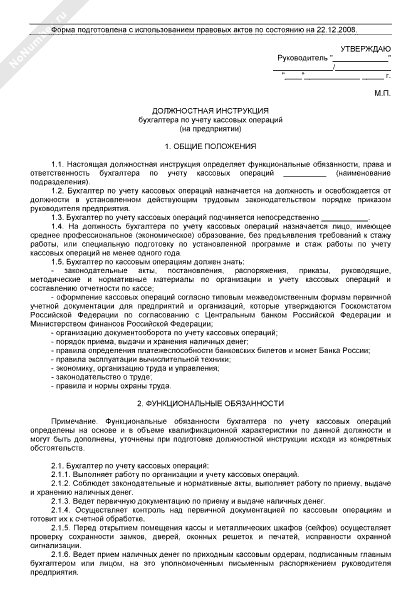 - 619Должностная инструкция бухгалтера по учету кассовых операций (на предприятии)