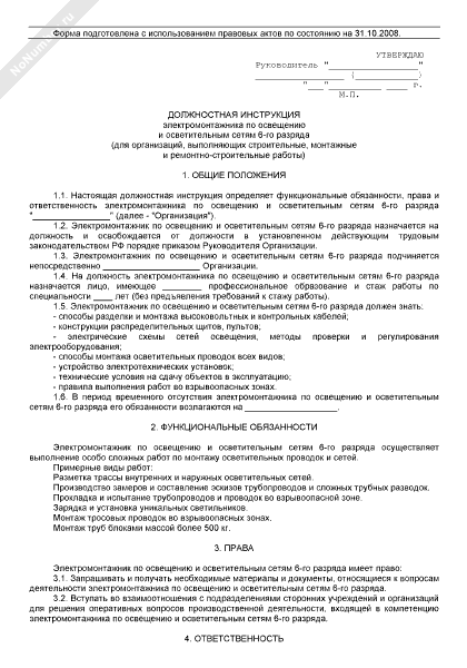 - 609Должностная инструкция электромонтажника по освещению и осветительным сетям 6-го разряда (для организаций, выполняющих строительные, монтажные и ремонтно-строительные работы)