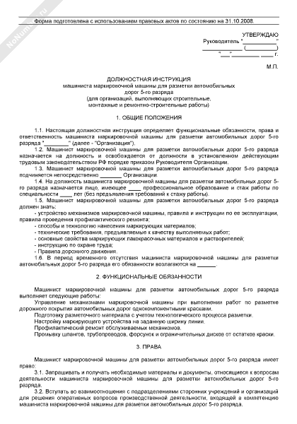 - 613Должностная инструкция машиниста маркировочной машины для разметки автомобильных дорог 5-го разряда (для организаций, выполняющих строительные, монтажные и ремонтно-строительные работы)