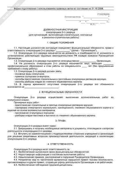 - 610Должностная инструкция огнеупорщика 2-го разряда (для организаций, выполняющих строительные, монтажные и ремонтно-строительные работы)