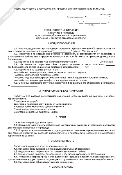 - 602Должностная инструкция паркетчика 5-го разряда (для организаций, выполняющих строительные, монтажные и ремонтно-строительные работы)
