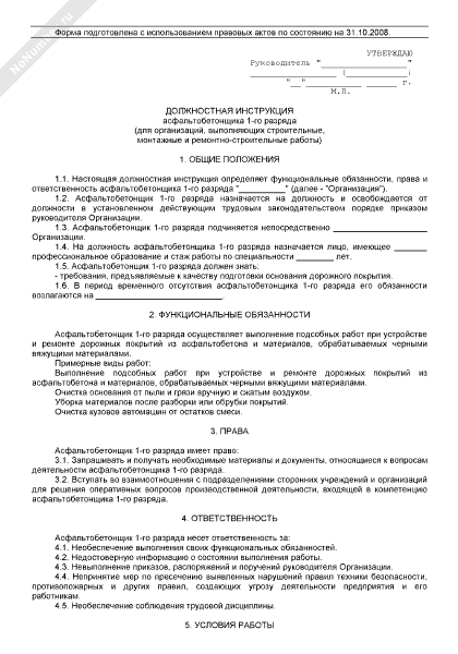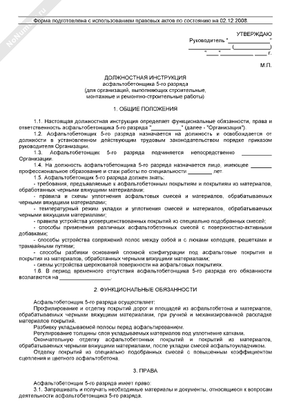 - 684Должностная инструкция асфальтобетонщика 5-го разряда (для организаций, выполняющих строительные, монтажные и ремонтно-строительные работы)