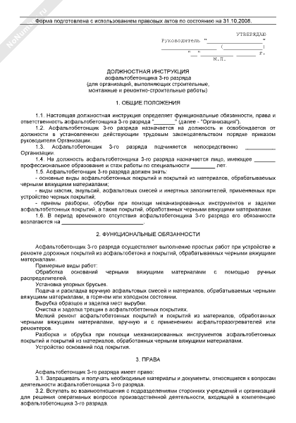 - 685Должностная инструкция асфальтобетонщика 3-го разряда (для организаций, выполняющих строительные, монтажные и ремонтно-строительные работы)