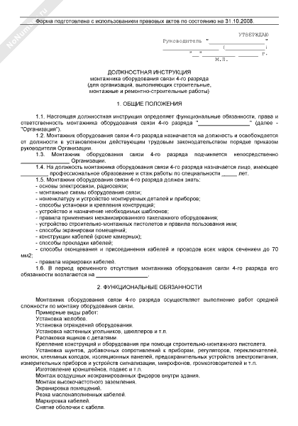 - 693Должностная инструкция монтажника оборудования связи 4-го разряда (для организаций, выполняющих строительные, монтажные и ремонтно-строительные работы)