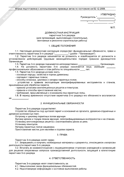- 696Должностная инструкция паркетчика 3-го разряда (для организаций, выполняющих строительные, монтажные и ремонтно-строительные работы)