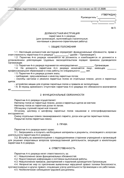 - 694Должностная инструкция паркетчика 4-го разряда (для организаций, выполняющих строительные, монтажные и ремонтно-строительные работы)