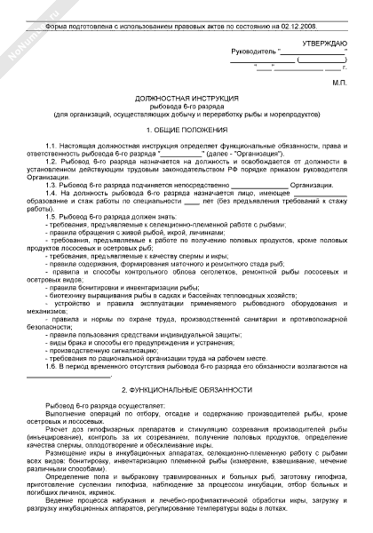 - 686Должностная инструкция рыбовода 6-го разряда (для организаций, осуществляющих добычу и переработку рыбы и морепродуктов)