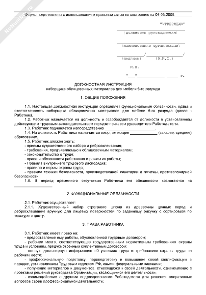 - 780Должностная инструкция наборщика облицовочных материалов для мебели 6-го разряда