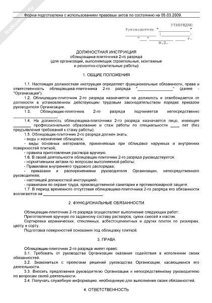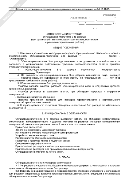 - 763Должностная инструкция облицовщика-плиточника 3-го разряда (для организаций, выполняющих строительные, монтажные и ремонтно-строительные работы)