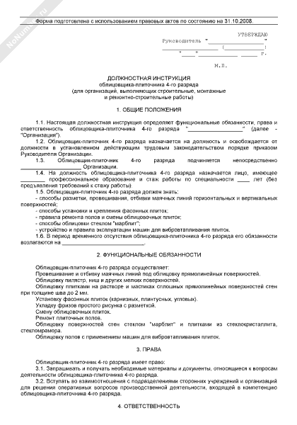 - 764Должностная инструкция облицовщика-плиточника 4-го разряда (для организаций, выполняющих строительные, монтажные и ремонтно-строительные работы)