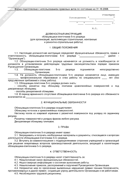 - 767Должностная инструкция облицовщика-плиточника 5-го разряда (для организаций, выполняющих строительные, монтажные и ремонтно-строительные работы)
